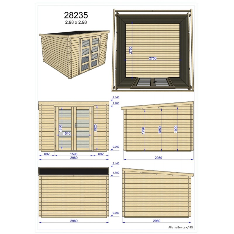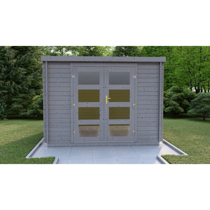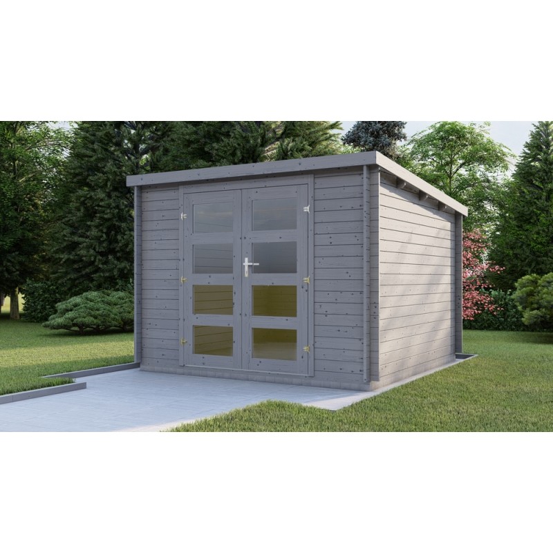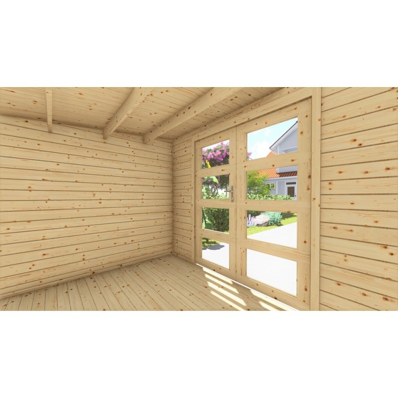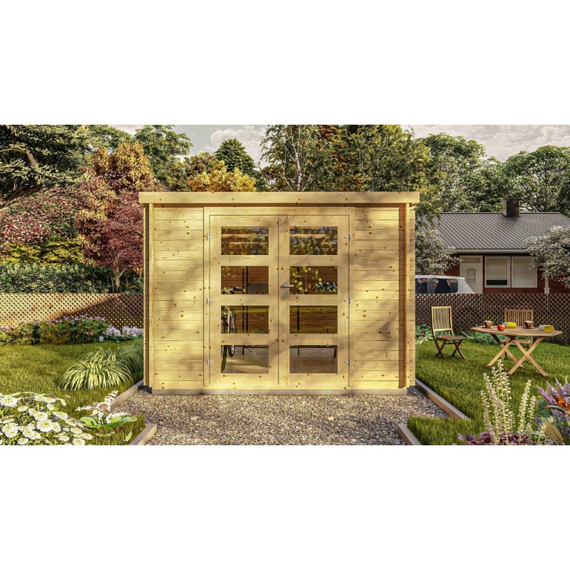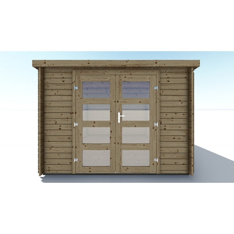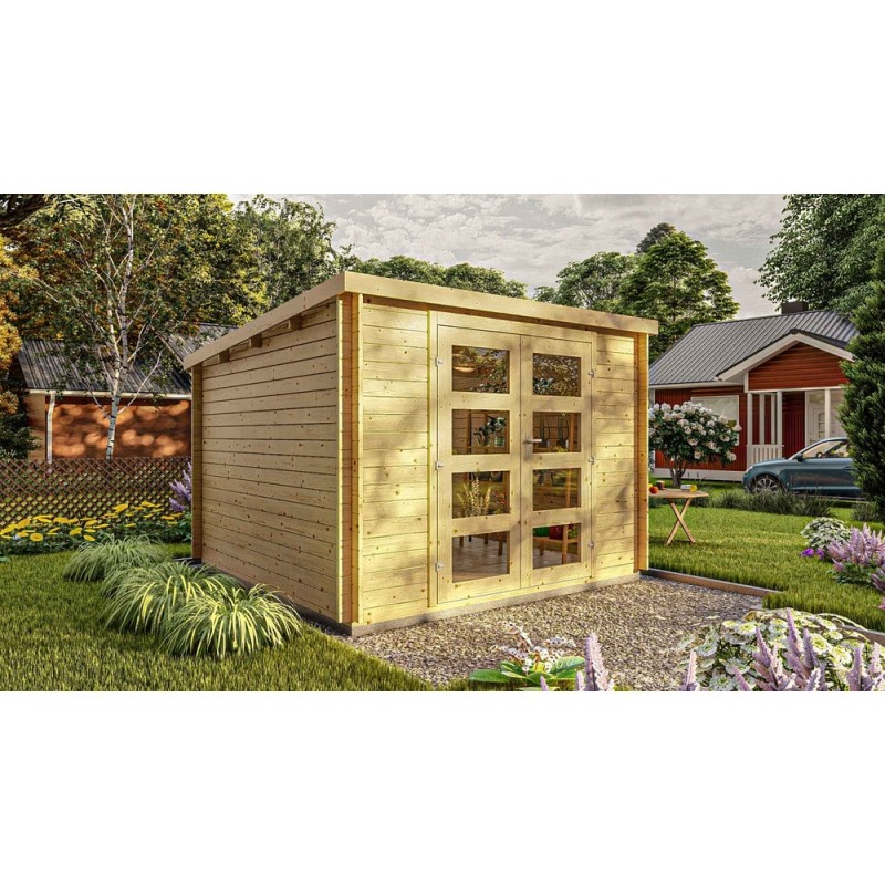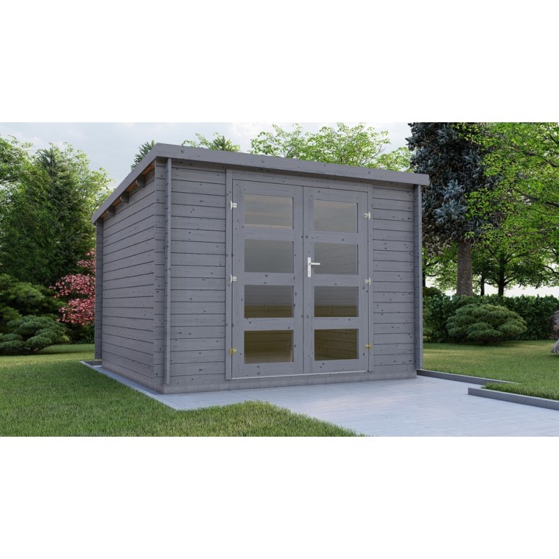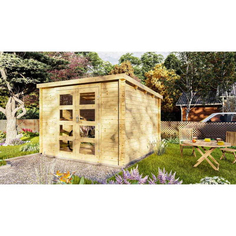 Garden Shed Log Cabin AleskaPro 3m x 3m es una habitación al aire libre perfecto para su uso como una sala de almacenamiento, casa de verano, área de taller. Una construcción de jardín asequible y de alta calidad, perfecta para jardines con un espacio limitado. Completada con tablas de suelo T&G de 19 mm y cubierta de techo.